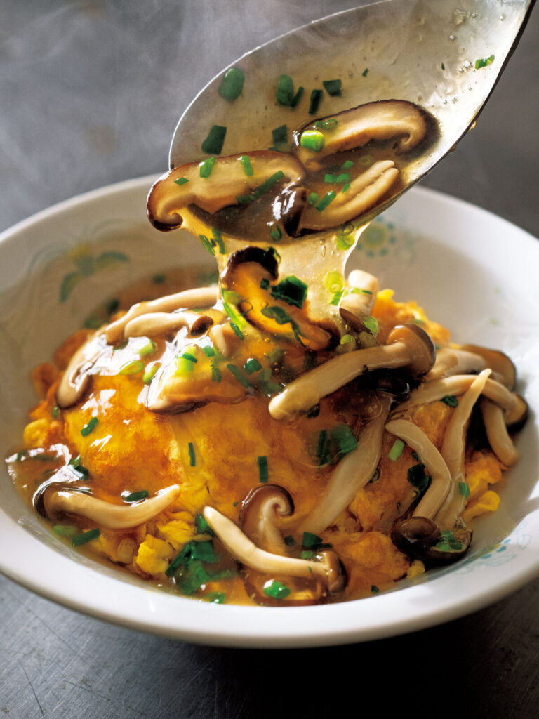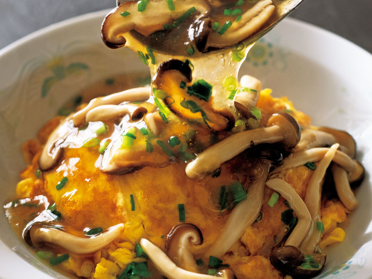 香り豊かなしいたけとしめじをたっぷり使った『きのこ天津飯』は、やさしいだしの旨みがふんわり卵と相性ぴったり。とろとろのあんがからんだご飯に、思わずにんまりしてしまいます。