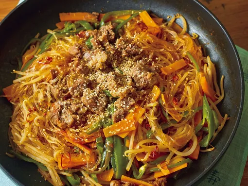 春雨の戻し不要、フライパンで10分蒸すだけ!『牛肉と彩り野菜のチャプチェ風』