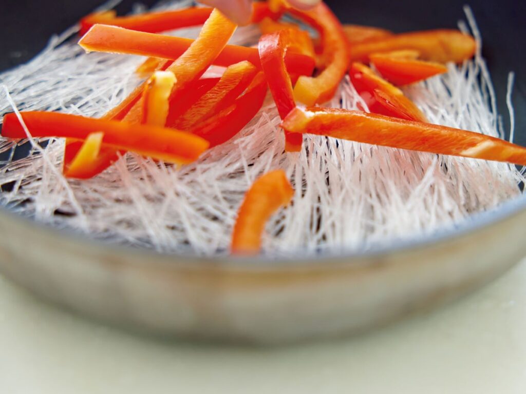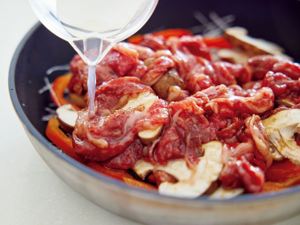 直径24cmのフライパンに、春雨、パプリカ、しいたけを順に広げ入れる。牛肉を汁ごと広げ入れ、〈B〉を回しかける。