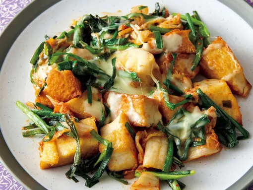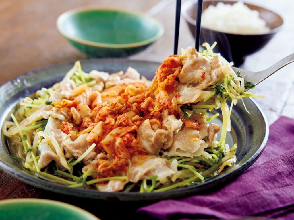 味しみのポイントは「重ね順」。もやし、豆苗、豚肉、キムチ…と、順番を守ってフライパンに入れてくださいね。