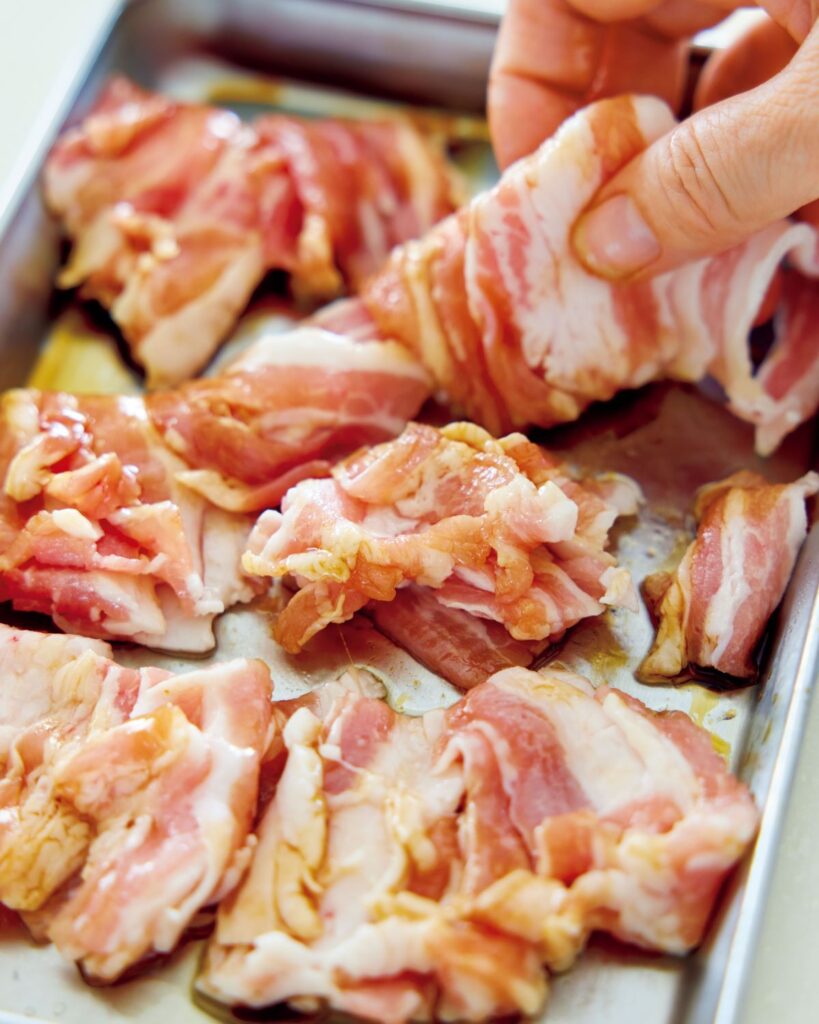 豆苗は根元を切り、長さを3等分に切る。白菜キムチは粗く刻む。豚肉は長さ4cmに切ってバットに入れ、〈A〉を加えてからめる。