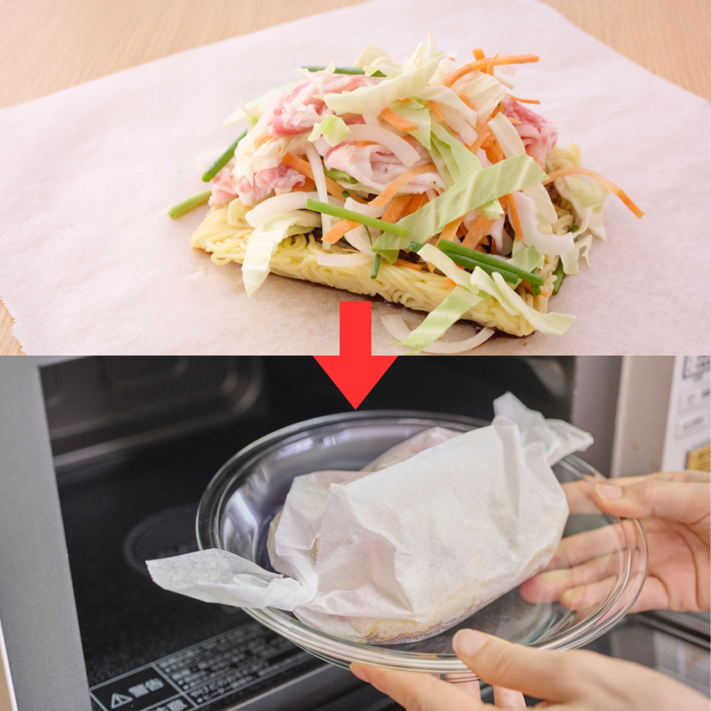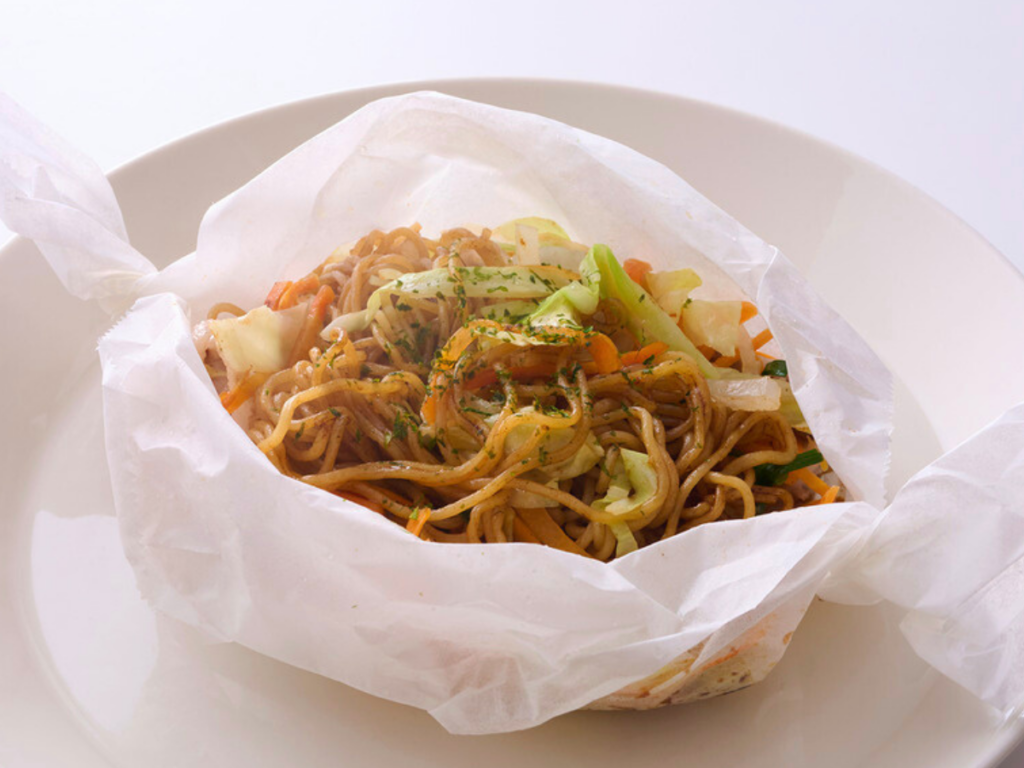 30×30cmに切ったクッキングシートの真ん中に焼きそば用蒸し麺1玉を置き、添付の粉末ソース1袋と水大さじ3をふって、好みの野菜約100ɡと肉やウインナソーセージ適宜をのせます。シートの手前と奥を合わせて具材を包み込み、両端をしぼってキャンディ包みにしたら、耐熱皿にのせて電子レンジ(600W)で約4分加熱。