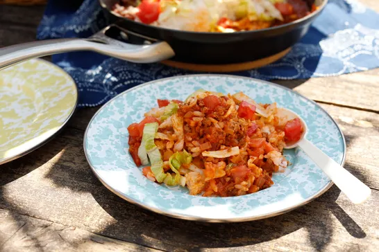 漬け込み肉×トマトジュースで簡単♪ 『混ぜ混ぜタコライス』で映えキャンプ飯【レシピ公開】