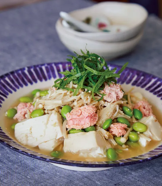 つるんとさっぱり食べられる『たらこと枝豆のめんつゆ蒸し豆腐』 のレシピ