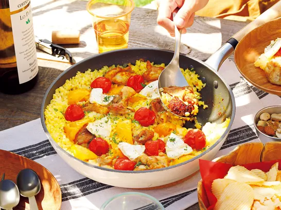 『鶏ももとカマンベールのカレーパエリア』でこじゃれキャンプごはん♪【レシピ公開】