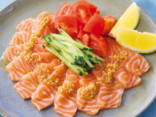 【ひんやり前菜】にんにくオイルで食欲アップ〈サーモン&夏野菜〉のおかずサラダ