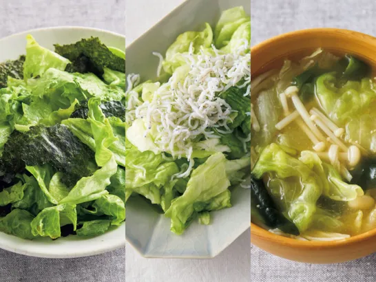 〈旬で安いレタスのやみつき三変化レシピ〉しらすレモン・海苔サラダ・くたくたみそ汁
