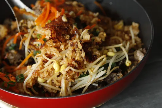 コレ世界一簡単かも…⁉米も具もフライパンで炊く【一発ビビンバ】焼き肉のたれで