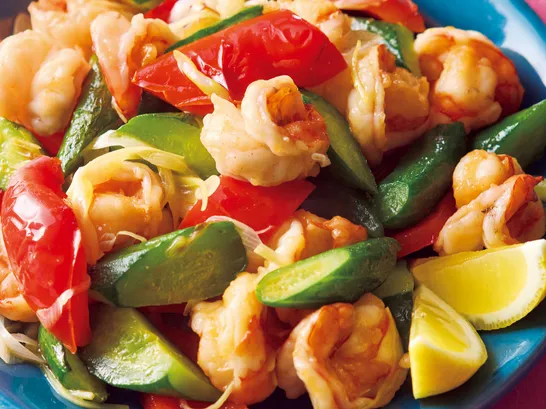 1日に必要な野菜1/2量無理なくペロリ『パプリカときゅうり、えびの生姜蒸し炒め』