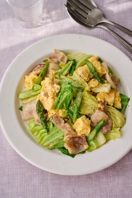貧血に効く薬膳レシピ「春キャベツと豚こまとアスパラの卵炒め」味つけは塩だけ!