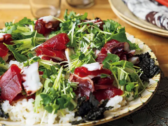 お正月用の刺し盛りが余ったら。簡単『まぐろとたこのちらし寿司』を【刺し身をのせるだけ】