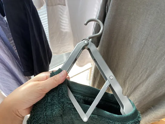 「DAISO折りたたみハンガー」が超コンパクト。家でも旅先でも、洗濯物も取り込みやすい!