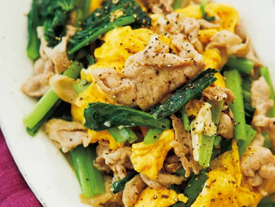 【スタメン節約食材3つですぐでき】『豚こまと小松菜のとろたま炒め』の絶品レシピ