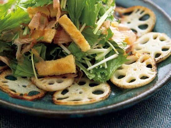 酢じょうゆでさっぱり!『焼きれんこんと水菜のサラダ』のレシピ【ホムパにも】