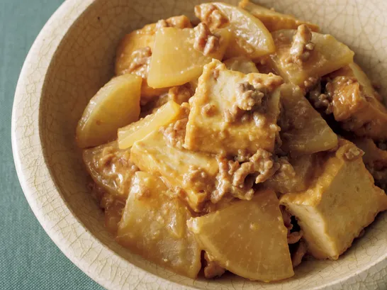 【節約食材3つで】こっくり味しみ、ご飯がすすむ!『厚揚げと大根のみそ煮』のレシピ