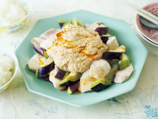 鶏胸×豆腐で絶品おかずに。バンバンジー風だれの『蒸しなすと鶏むねの豆腐ごまだれがけ』