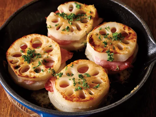 重ねて焼くだけ!生ハムチーズで『れんこんのミルフィーユ焼き』。おつまみにも最高