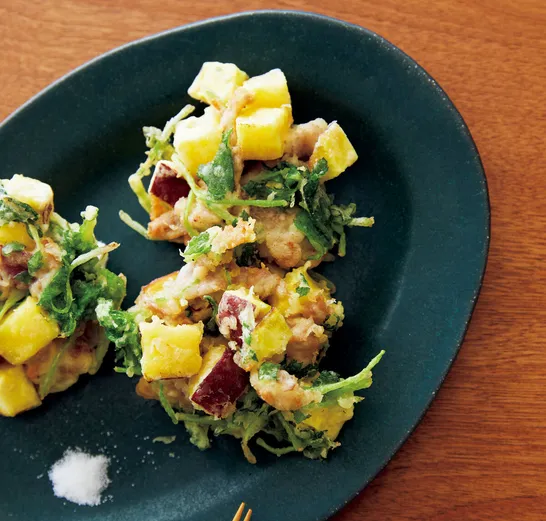 魅惑のほっくり食感『さつまいもと豚こまのかき揚げ』のレシピ【天ぷら粉でも小麦粉でも】