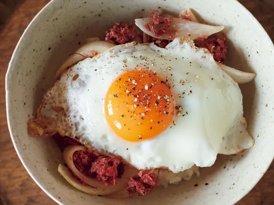 【連休明けを救うレシピ】買い物いらずの激ウマコンビーフ丼【卵と玉ねぎ、ソース味】