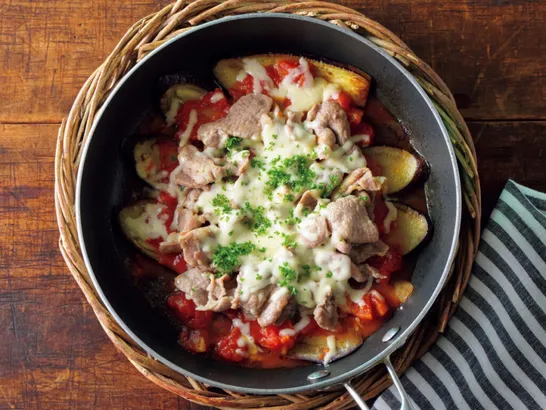 トマト缶・なす・豚肉で。とろ~りチーズの『なすと豚肉のピザ風チーズ焼き』