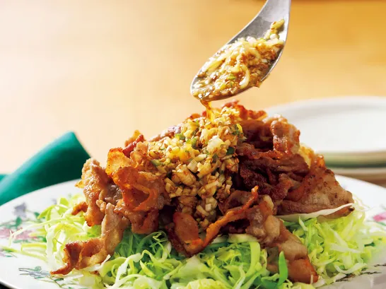 キャベせんと豚バラの上にたれをたっぷり『カリカリ豚の薬味だれサラダ』のレシピ