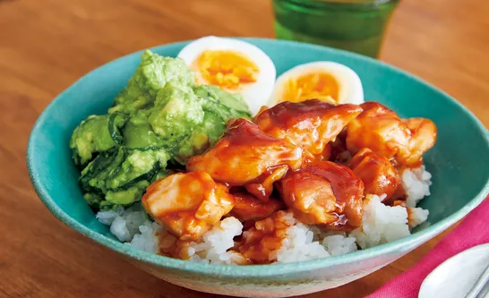 この照り感がたまらない!『アボカドきゅうりのチキンロコモコ』のレシピ【手軽なおうちランチ】