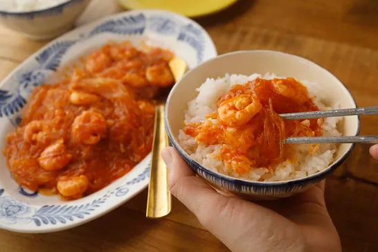 えび半量でも大満足『ジューシーすぎるエビチリ春雨』のレシピ【節約なのに絶品!】