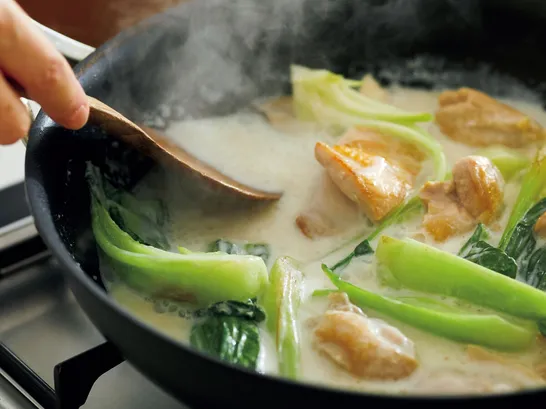 あつあつがおいしい!『青梗菜と鶏ももの中華クリーム煮込み』のレシピ【寒い日に】