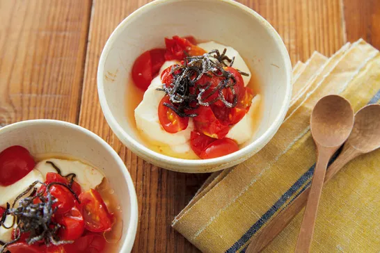 レンジ3分でうまうま!『ミニトマトと塩昆布の温やっこ』のレシピ【ごま油風味】