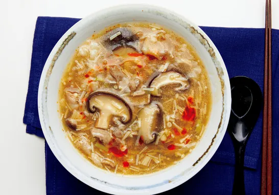 【朝冷凍させて夜煮るだけ!】酸味がくせになる「豚肉ときのこの酸辣湯」のレシピ