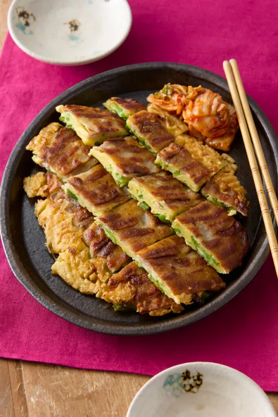 ピーマン3個ペロリ。混ぜて焼くだけ『豚バラピーマンチヂミ』献立/トマトの簡単副菜で