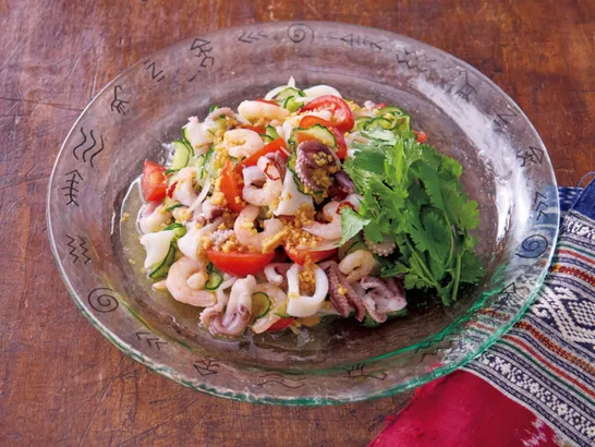 冷凍シーフードミックスと夏野菜で簡単『シーフードのタイ風サラダ』暑い日に食べたい!