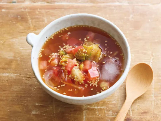 烏龍茶が絶品スープに!?火を使わずに混ぜるだけ『トマト&キムチのピリ辛冷製スープ』