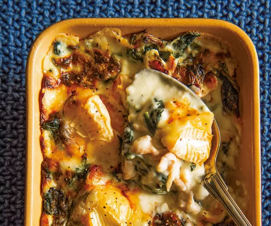 ちぎりカマンベールでうまみが深い!『豚肉とほうれん草のカマンベールグラタン』のレシピ