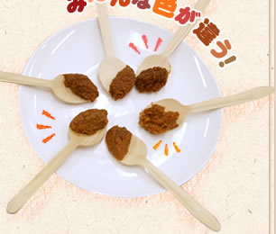 ![]() 会社のキッチンに、まめ部スタッフたちがそれぞれのおうちで仕込んで育てた〈手前みそ〉が集合しました。さっそく、スプーンですくって並べてみると、同じ大豆、同じ麹で仕込んだみそなのに、色や形状に違いが! 仕込みのときの大豆のつぶしぐあいや、みそを置いていた環境による熟成の進みぐあいなどで、こんなに差が出るとは驚きです。 |