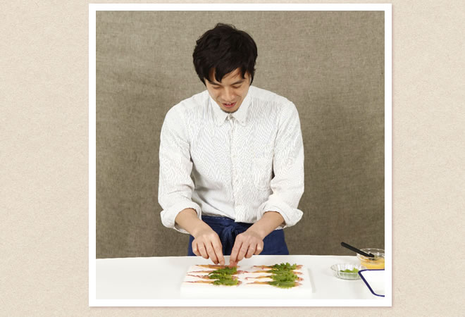 赤ときたら……そう、次は〈白〉。 甘みの強い白みそで、玉みそを作って、 「豚肉の玉みそはさみ焼き」にしました。 |