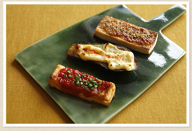 最後は、ひと皿で3種のみそが味わえる、 「3種のみそ田楽」で、締めましょう。 |