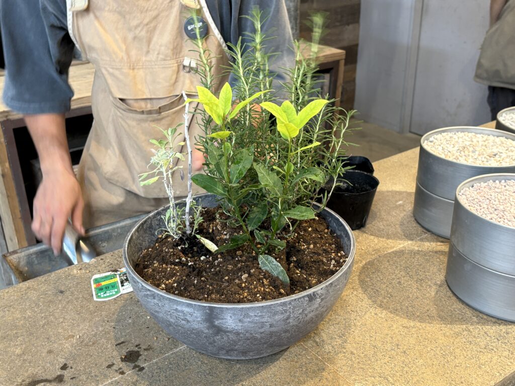 店員さんに、ハーブを育ててみたいと相談すると、1つの鉢で寄せ植えできること、プランターと苗を購入したら、サービスで土も入れて、植えた状態でお渡ししますよ、とありがたいお言葉が✨
