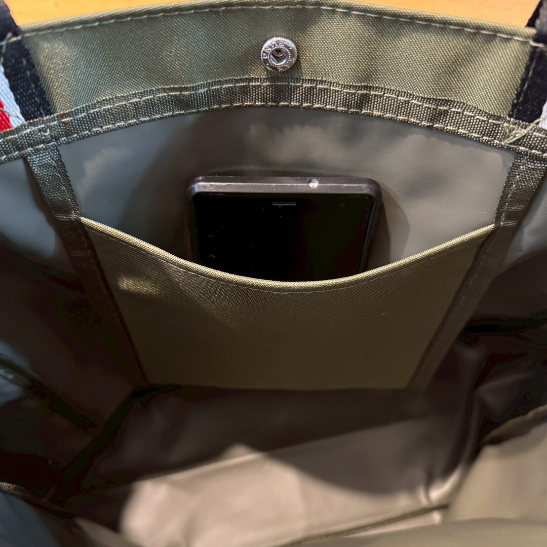 中のポケットはしっかり素材で、スマホを入れても余裕あり。