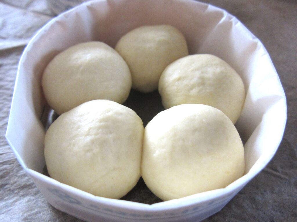 パン生地を5等分して丸めて、牛乳パックで作ったセルクルに入れて発酵させて、かぼちゃの皮で作ったヘタをつけて、焼きあげます。