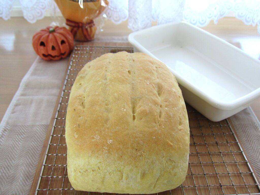 琺瑯の型に入れて焼いたかぼちゃパンです。