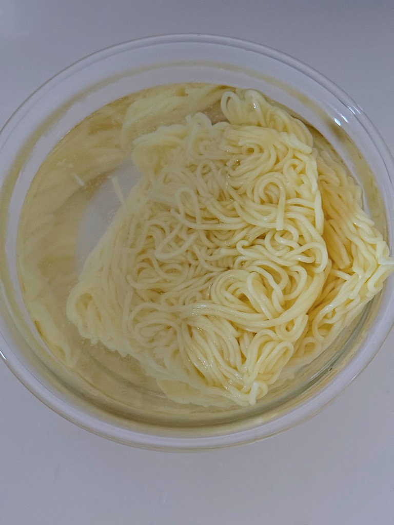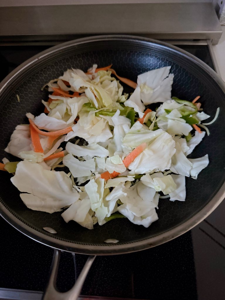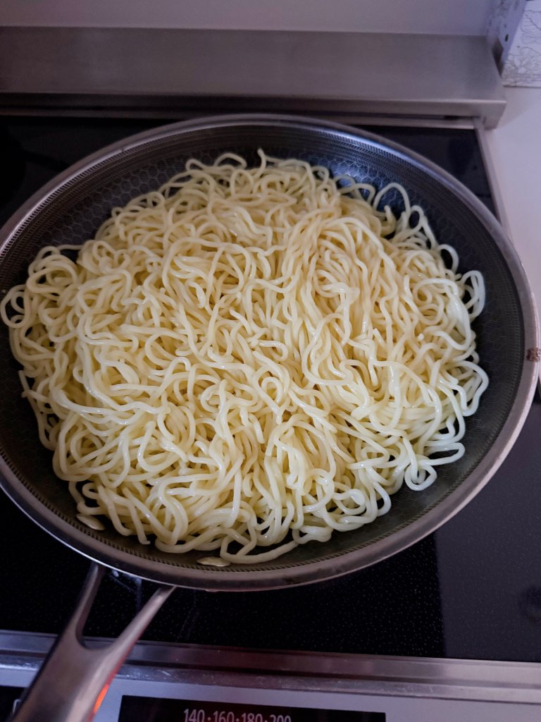 麺をサッと熱して取り出して、野菜と肉を炒めて