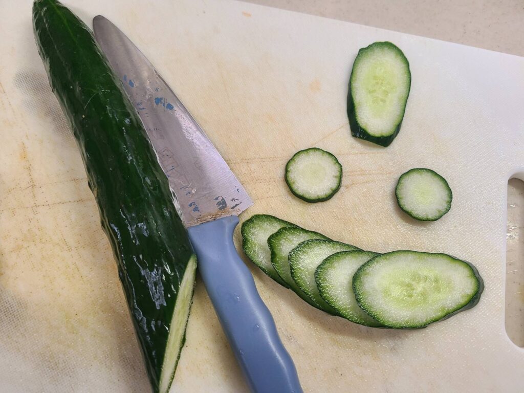 ③きゅうりは2枚だけ輪切りし(ハロウィンかぼちゃの目の部分)、他はすべて斜めに薄切りする。斜め切りのきゅうりはハロウィンかぼちゃのヘタの部分(1枚)や口の部分(5枚)、すりおろしにんじんの下に敷く土台部分(他すべての枚数)になります。