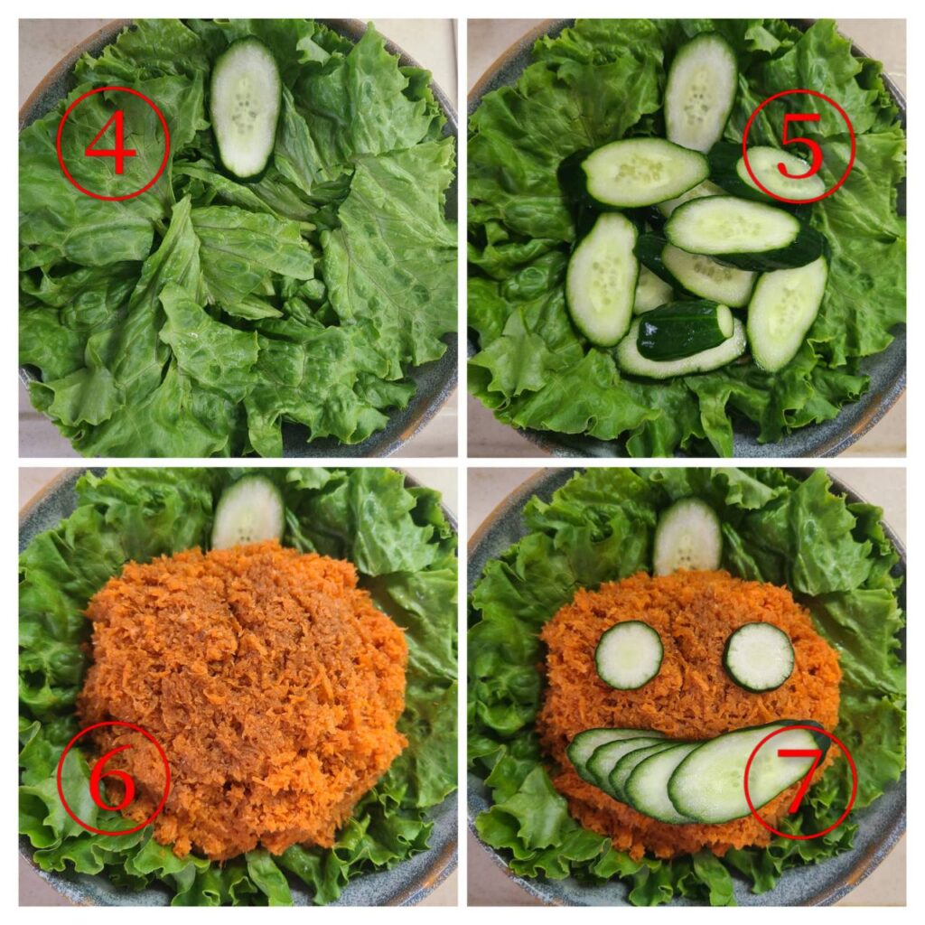 ⑦顔のパーツのきゅうり(目の部分:輪切り2枚、口の部分:斜め切り5枚を少し重ねながら並べる)をすりおろしにんじんの上にのせる。