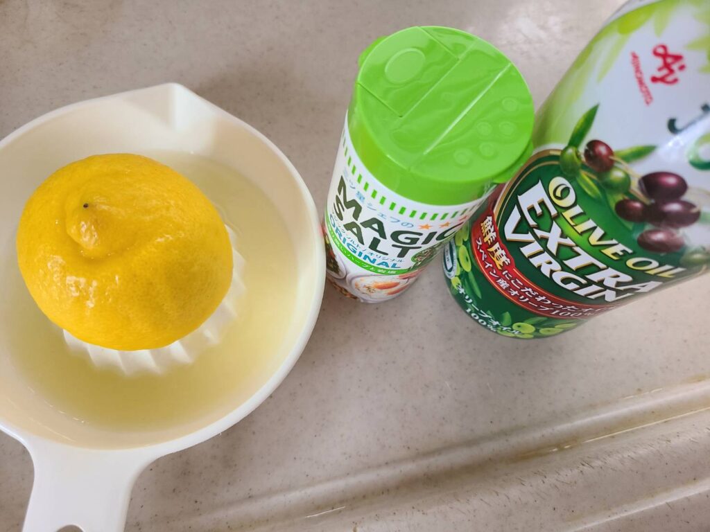 ⑧ドレッシングはレモン果汁、ハーブ塩、オリーブオイルをかけるだけ!レモン果汁はレモンを搾っても良し、市販のレモン果汁でもOKです。ハーブ塩はマジックソルト(オリジナル)を使いました。もちろん市販のドレッシングなど他の味付けでも美味しく食べられます。