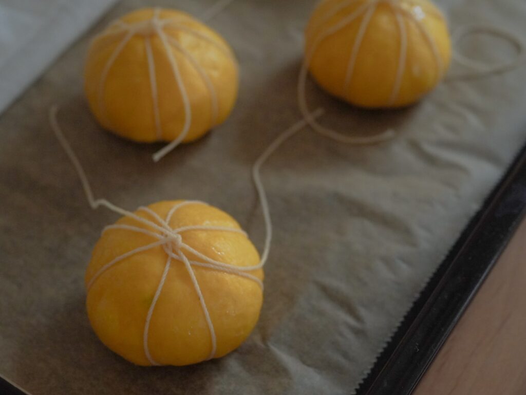 黄色の生地は丸め直し、タコ糸を巻いていきます。