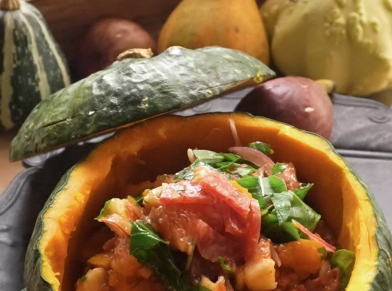 かぼちゃを器にして盛りつければ、ハロウィンのテーブルにもぴったり。
