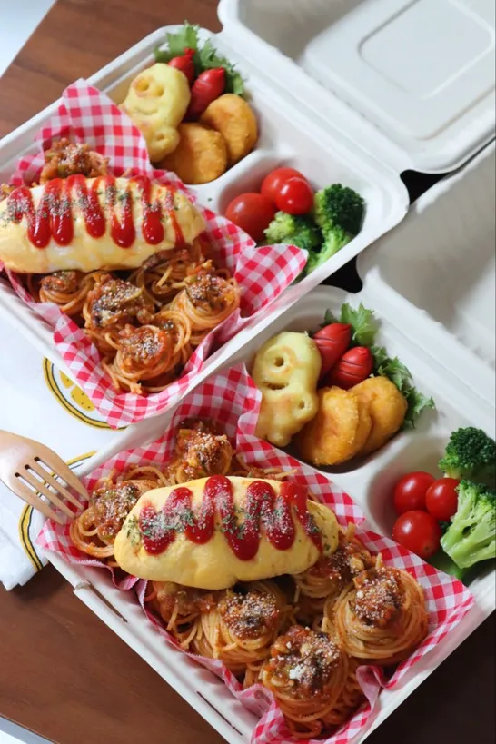 夏野菜たっぷりミートパスタ弁当 レンチンオムレツ作り方有【おすすめの食べ方】