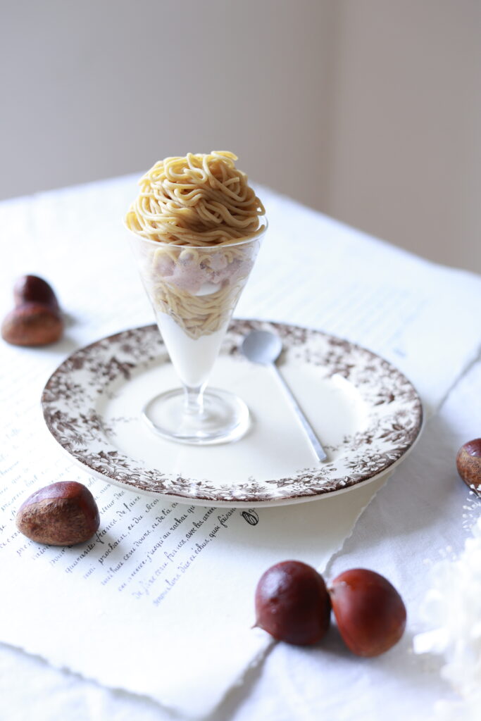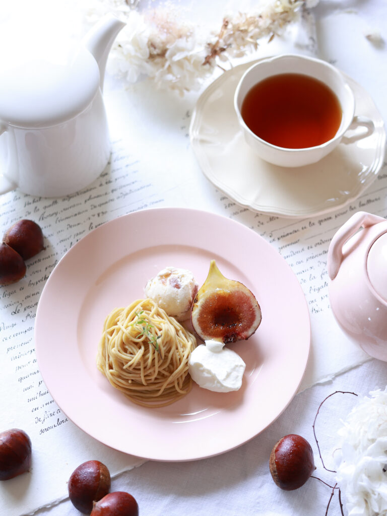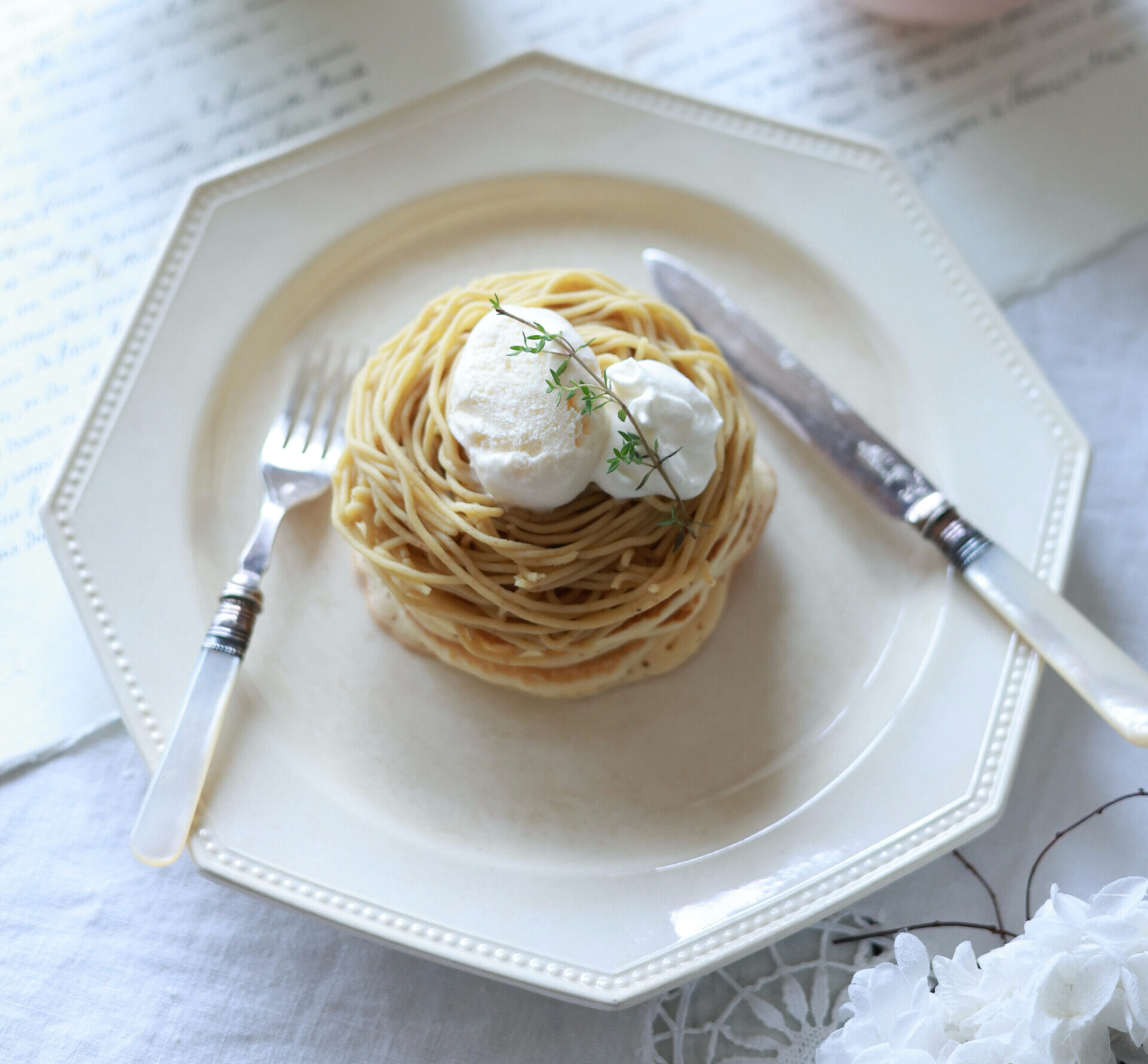 パンケーキの上にもモンブランクリームをたっぷりと絞って