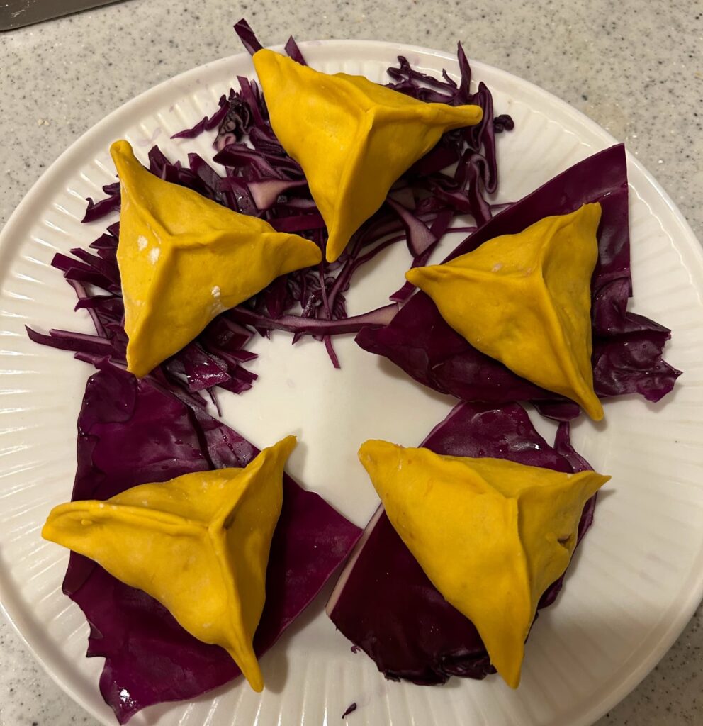 無難にゆでて水餃子として作り、紫キャベツは添えることにしました。